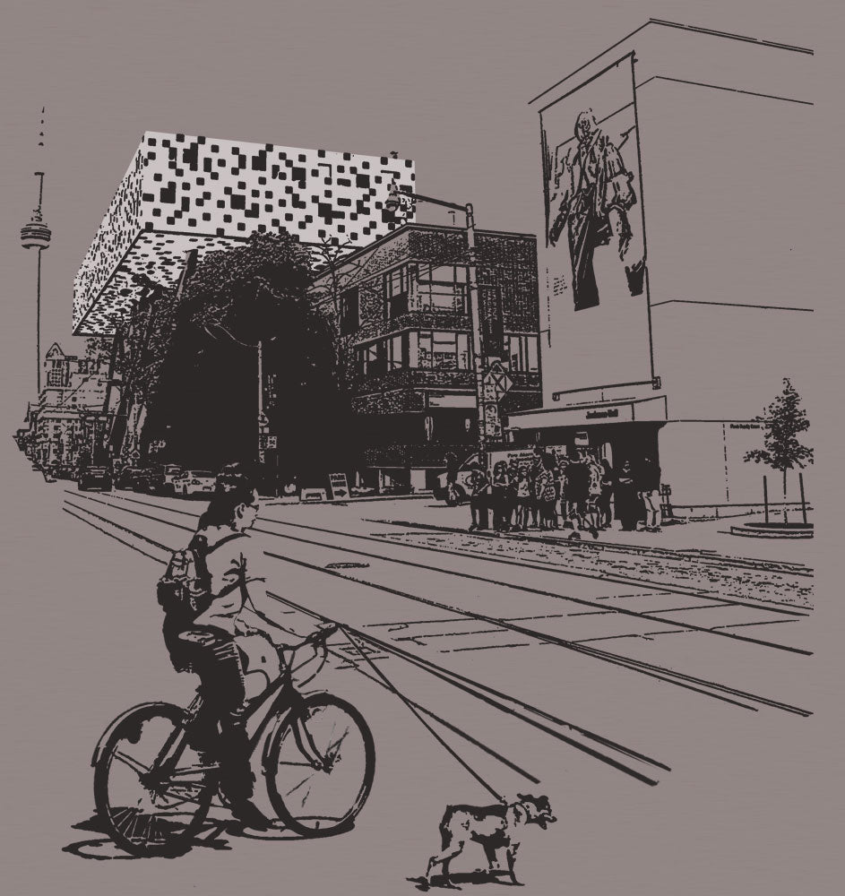Futuristic objects line up in Toronto. Draw a straight line from the CN tower to the ROM and it will cross a giant checkered cube, resting on pencil-shaped pillars. This is the main building of the prestigious 'Ontario College of Art & Design' (OCAD).